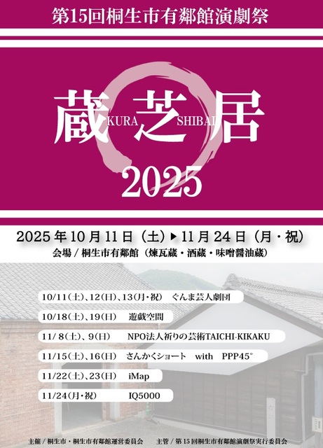 桐生市重要文化財の史的施設を活用して、隔年に一度の演劇祭(6団体15公演)を開催します。 出 演 ぐんま芸人劇団、…