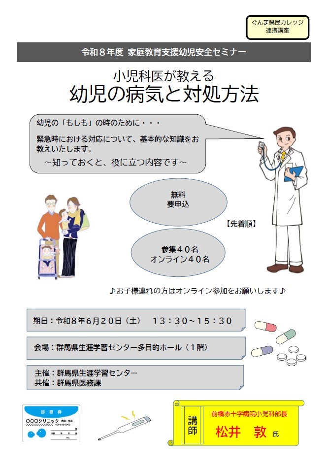 令和8年度家庭教育支援幼児安全セミナー 小児科医が教える幼児の病気と対処方法(群馬県生涯学習センター/前橋市)