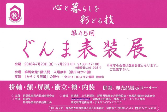 群馬県表具内装組合連合会による、掛け軸、額、屏風、衝立、ふすま、内装などの作品展を開催します。 ◆実演・体験コーナー…