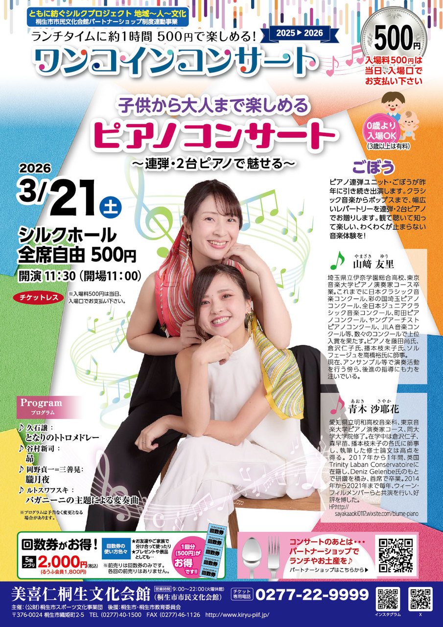 ランチタイムに1時間・500円で楽しめる! ワンコインコンサート 子供から大人まで楽しめるピアノコンサート~連弾・2台…