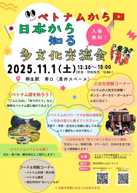 ベトナムの文化に興味がある方、外国人住民の方と交流してみたい方、桐生で国際交流を始めてみたい方、ぜひご参加ください♪ …