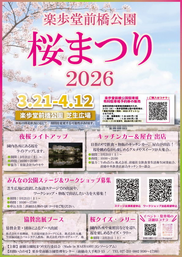 楽歩堂前橋公園(芝生広場)にて、 『楽歩堂前橋公園桜まつり2026』を開催いたします。 毎年の桜のライトアップはもち…
