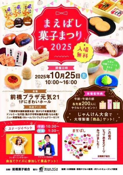 10月25日(土)まえばし菓子まつりを開催します。 8店舗の人気商品がまえばしラジオ前のイベントスペースに勢ぞろい!…