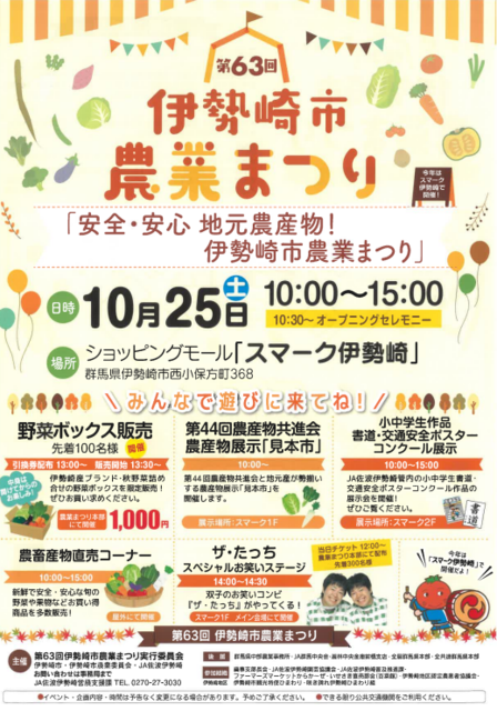 伊勢崎市農業まつりは、伊勢崎市のさまざまな地場産農産物を知ってもらい、地場産農産物への親しみと消費を拡大することを目的…