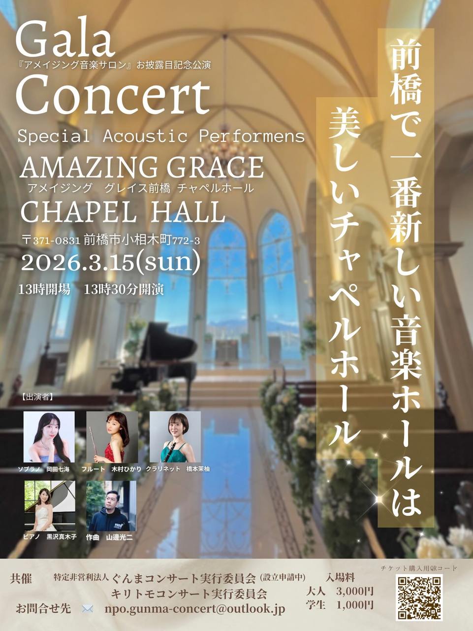 アメイジンググレイス前橋チャペルホールお披露目の特別記念ガラコンサートを開催する事となりました。 ご来場の皆さまに、チ…