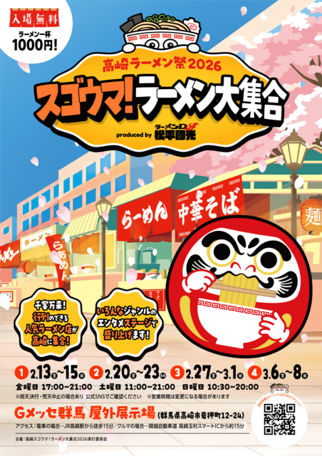 行列のできるラーメン店が高崎市に大集合!地域初 大型ラーメンフェスが 26年2月・Gメッセ群馬で開催決定です!! チ…