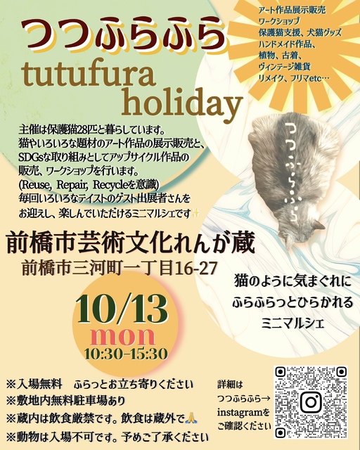 保護猫28匹と暮らす主催者が、ふらっと開催するマルシェです。 保護猫支援となるアートの展示販売をしつつ、アップサイクル…