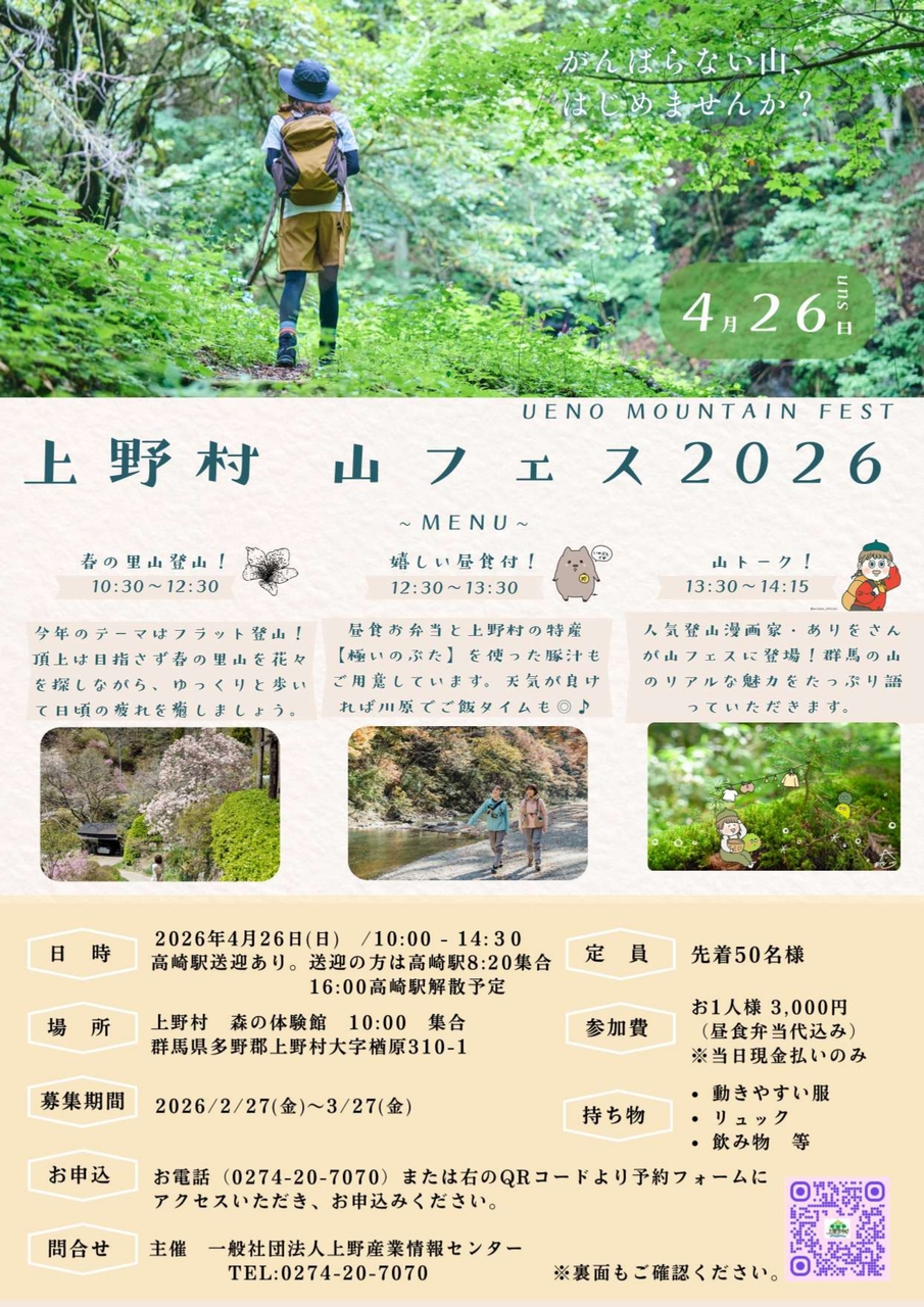 2026年4月26日(日)、群馬県上野村にて「上野村 山フェス2026」を開催いたします。 本イベントは、自然の中を…