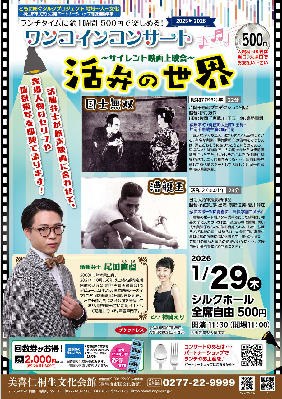 ランチタイムに1時間・500円で楽しめる! ワンコインコンサート 活弁の世界~サイレント映画上映会~を開催します 無…