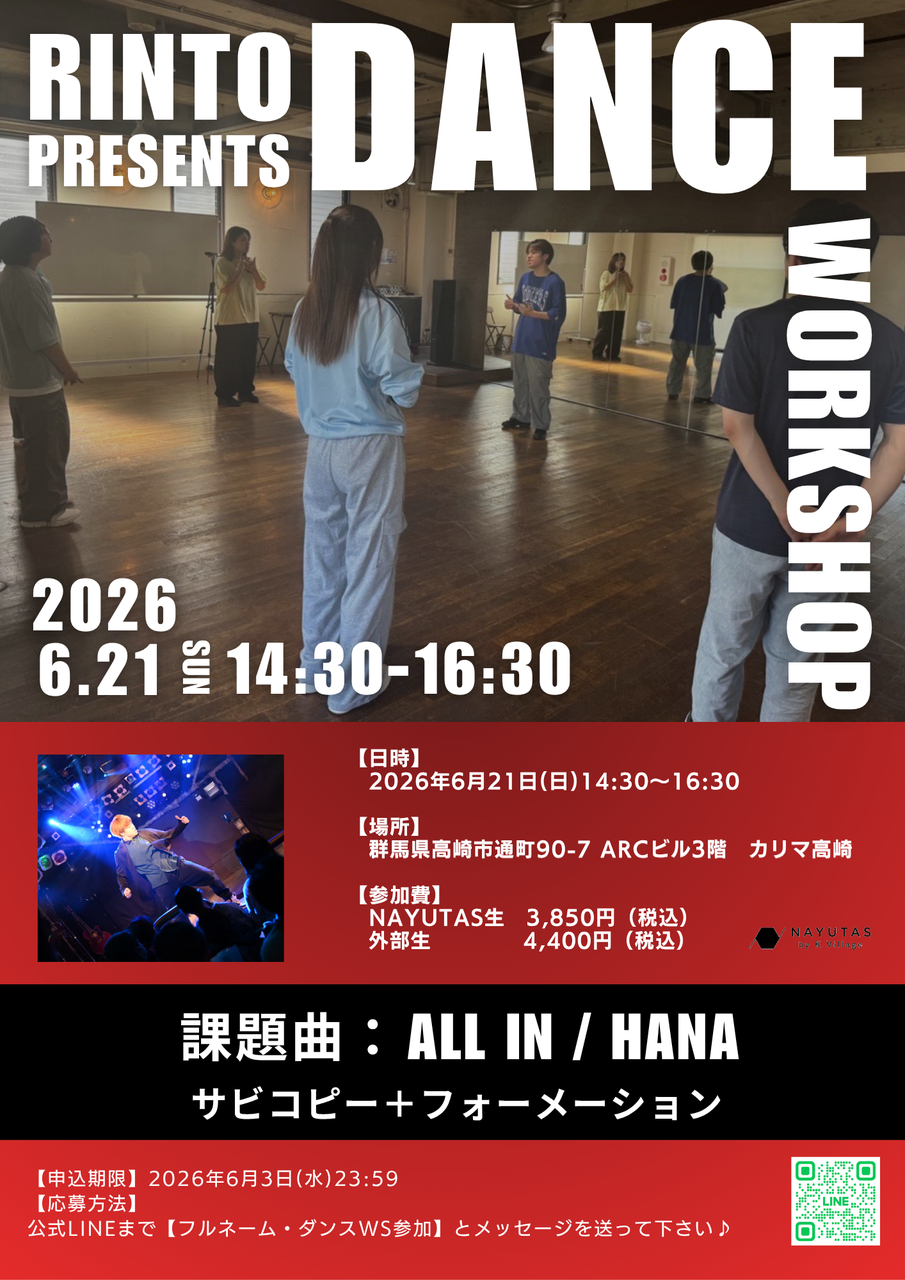 ダンス・ボイストレーニングスクールNAYUTAS高崎校ダンスWS開催 ▶︎▷どなたでも参加可能! 日時 2026年…