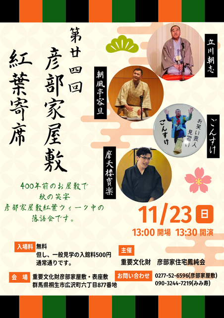 江戸時代初期に建てられた国指定重要文化財の「彦部家住宅」で、秋の恒例行事『紅葉狩りウィーク』の一環として落語会「紅葉寄…