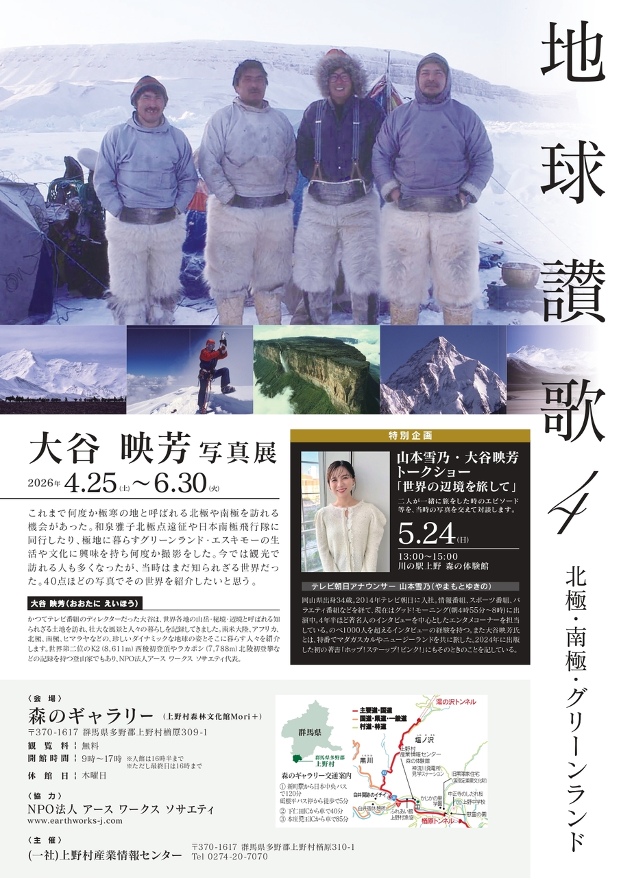 写真家・大谷映芳氏が北極・南極・グリーンランドで撮影した作品約40点を展示し、極地の自然やそこに暮らす人々の姿をご紹介…