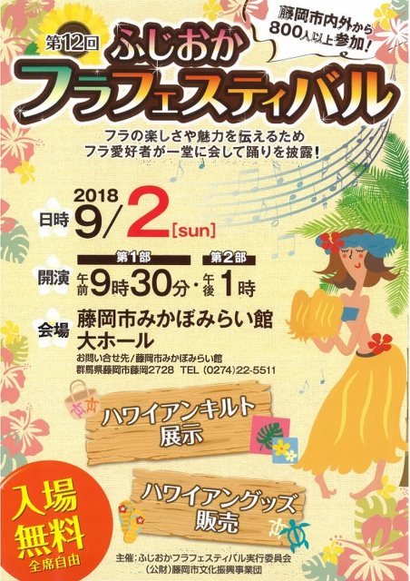 フラの楽しさ・魅力を伝えるため、フラ愛好家が一同に会してそのダンスを披露します♪ ハワイアンキルトの展示、ハワイアング…