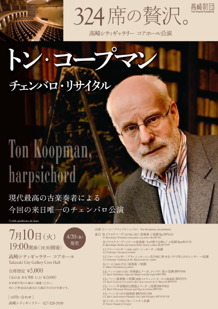 現代最高の古楽奏者による、今回の来日唯一のチェンバロ公演 出演: トン・コープマン (チェンバロ) 曲目: D.ブ…