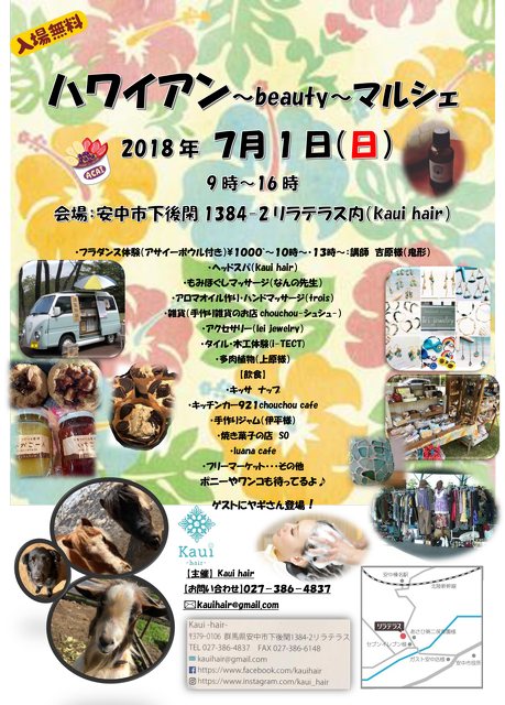 安中市の美容室「kauihair」主催の「ハワイアン~beauty ~マルシェ」 フラダンスやヘッドスパなどの体験&美…