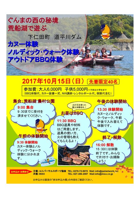 下仁田町の道平川ダム・荒船湖でBBQ、カヌー、ノルディック・ウォークがまとめて体験出来ちゃうイベントです。 日にち 2…