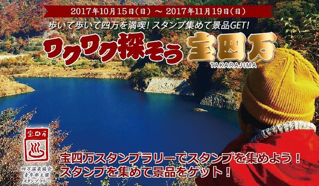 宝四万スタンプラリーでスタンプを集めよう! スタンプを集めて景品をゲット! 四万温泉では、10/15(日)~11/19…
