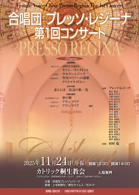 声楽家やピアニスト、フルート奏者などプロミュージシャンたちで新しく結成された合唱団「プレッソ・レジーナ」が、 クリスマ…