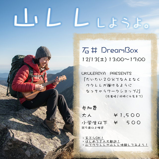 山レレしようよ。「だいたい20分でなんとなくウクレレが弾けるようになっちゃうワークショップ♪」(山とスキーの店 石井Dream Box/伊勢崎市)