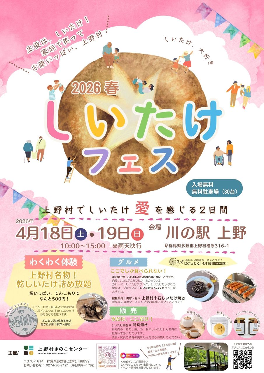 株式会社上野村きのこセンター(群馬県上野村)は、2026年4月18日(土)・19日(日)の2日間、 川の駅上野にて「し…