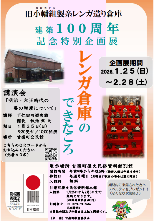 旧小幡組製糸レンガ造り倉庫 建築100周年記念特別企画展 開催します! 甘楽町歴史民俗資料館は、大正15年(192…