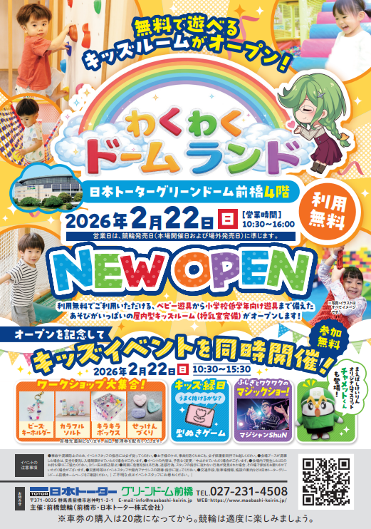 2026年2月22日(日)日本トーターグリーンドーム前橋(前橋競輪場)に新しいキッズルーム「わくわくドームランド」がオ…