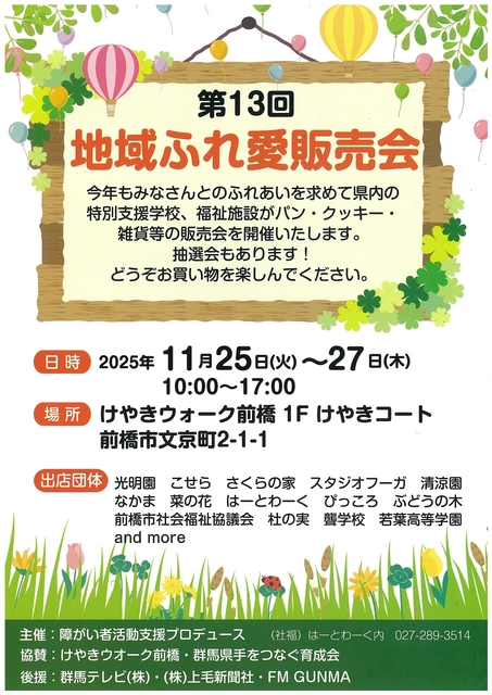 第13回をむかえる 地域ふれ愛販売会を開催いたします。 県内福祉団体による 利用者様と共に製作した雑貨や手作り焼き菓…