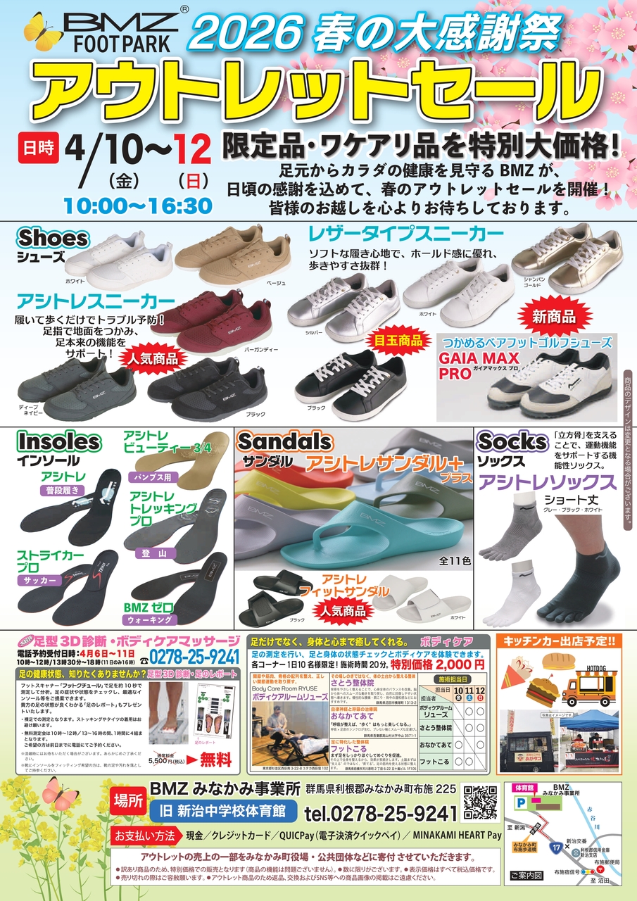 みなかみ町から世界中の人々へ、足元から健康元気を届けるBMZが、18回目となるアウトレットセールを開催します。 4/1…