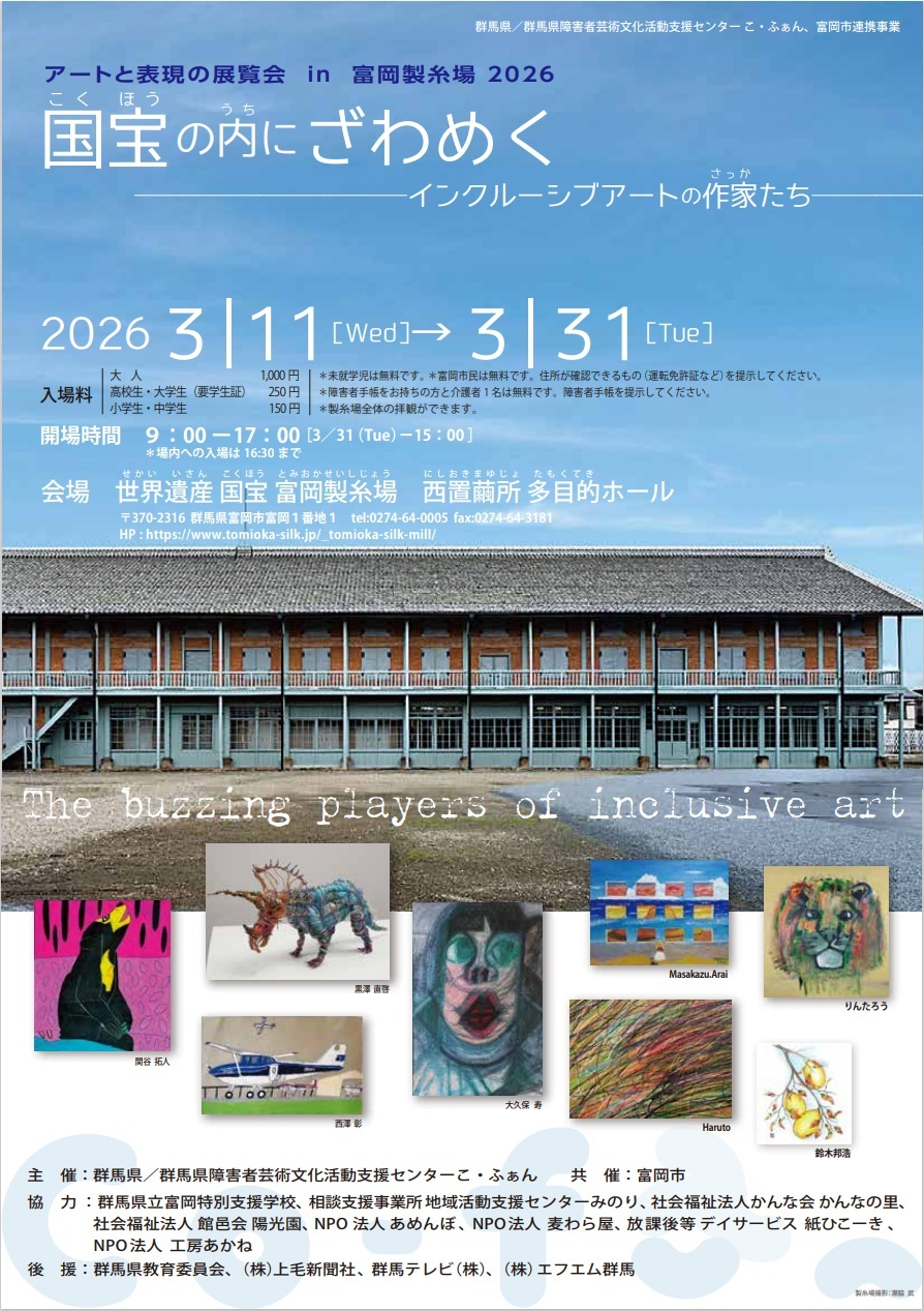 群馬県内外11人の作家の約100点の作品展示を行います。触れる立体作品や、平面作品の一部を凹凸におきかえた触察作品カー…