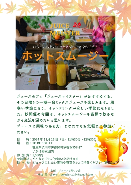 ジュースのプロ「ジュースマイスター」がおすすめする、 その日限りの一期一会ミックスジュースを楽しみます。 肌寒い季節に…