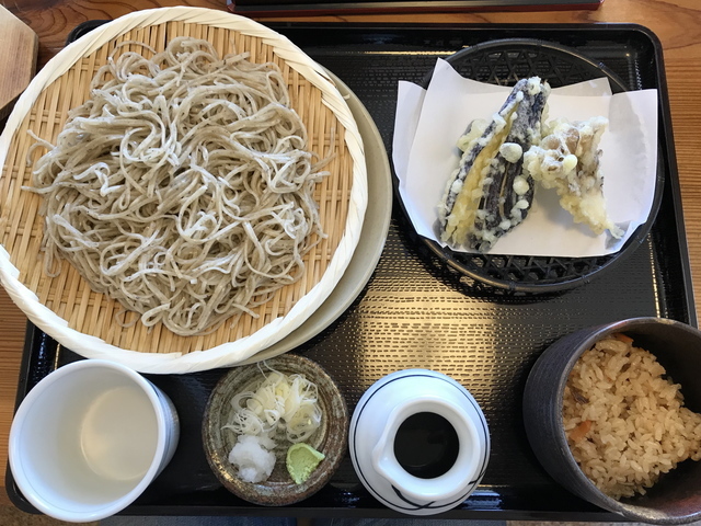 地元で評判と聞きつけ初めて伺いました。11時15分頃着いたのに、既に10台ほど先客が。さすがの人気店ですね!30食限定ランチをお願いしました。混んでいる割に注文してから10分と経たずに出て来ました。そばに天ぷらと炊き込みご飯が付いて税込1,000円とお得です。独特の麺はボリューム十分、つゆと相まって美味。天ぷらはなす、舞茸、ピーマン、こちらも美味しいです。合間に頂く炊き込みご飯は味付けもしっかりして、おまけでないちゃんと一品。店員さんは感じよく動きもテキパキ。片付けの際にはきちんと一席ずつ除菌していました。伊勢崎にまた一つ名店を発見しました♪