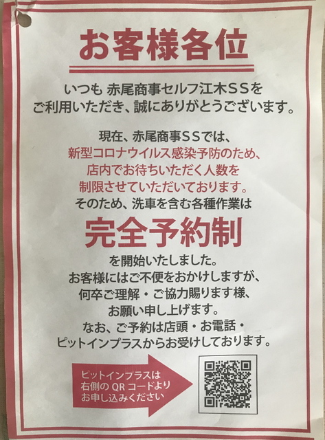 今回もいつもの給油。給油機ごとに消毒スプレーが備え付けられていました。まいどカードだけでなく楽天ポイントも使えるので、お得に給油できました♪ 何か写真をと思いましたが何もなく、給油機にあったお知らせを。洗車や作業が完全予約制になったそうです。