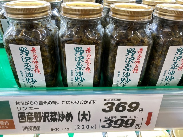「ツルヤ研究家」モッチーさんほどではないですが、私も最近は週一回のツルヤ通いが定着しました…客員研究員ぐらいですかね(^^)通路が広くてカートを押しての買い物がしやすいです。野菜はほとんどが安心・安全な国内産でモノによってはかなり安い。嬉しいのはキノコ類がとても充実してること、肉厚のどんこ椎茸、なめこも大ぶり!えのきの軸の部分を輪切りにしてある「森のホタテ」…29円って安いの?高いの?(笑)お得なPBブランドや信州名産の商品も多くて、見て回るのが楽しいスーパーってやはり付加価値高いですよね。信州ワインもリンゴジュースも軽井沢の丸山珈琲も一度は試してみる価値があると思いますが、私のダントツのおススメは「野沢菜油炒め瓶詰」399円!安くて飽きないド定番の「ご飯の友」。ハマりますよ!コレ(^^)v