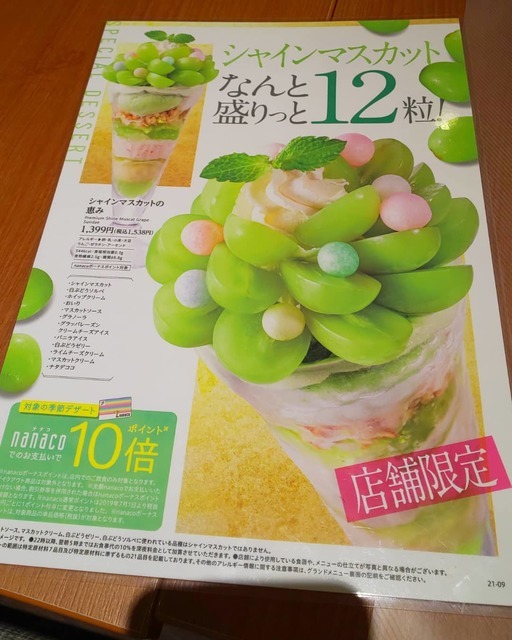 投稿:2021/09/27 掲載:2021/09/27 期間限定のシャインマスカットパフェです。 ファミレスなのに、クオリティーの高いパフェで、甘くておいしいシャインマスカットが味わえました。 デニーズ 前橋東善町店 前橋市ファミレス このクチコミに“ぐっ”ときた 3