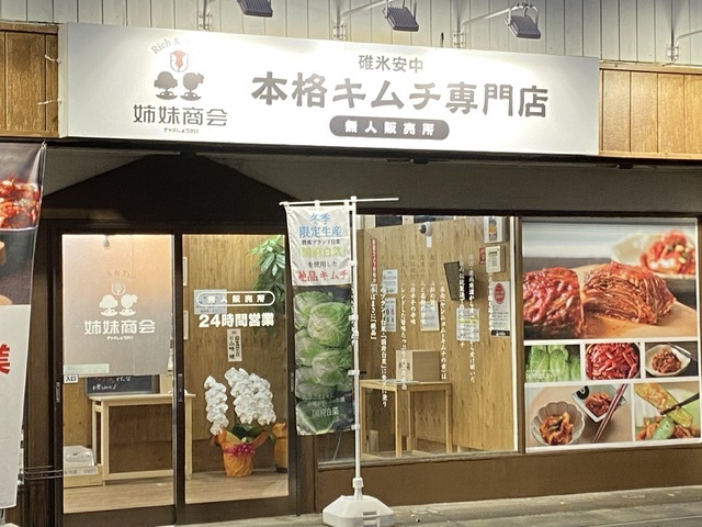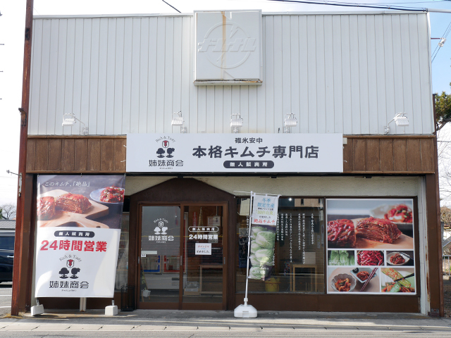 姉妹商会さんの24時間無人キムチ販売所(高崎市日高町)をよく利用しています。店内の冷蔵ガラスケースに美味しそうなキムチが数種並んでいて、商品を選んで料金箱にセルフで支払います。無人野菜販売所のシステムですね。ただ、防犯カメラはしっかり見てますよ笑笑。ここのオイキムチは水分が多くさっぱりしていて私好み!白菜キムチは本物過ぎてwww私にはちょっと味が強すぎな感じなので、松前漬けと混ぜて韓日の旨味競演にして美味しくいただいてます。さきイカのつまみも美味いですよ!