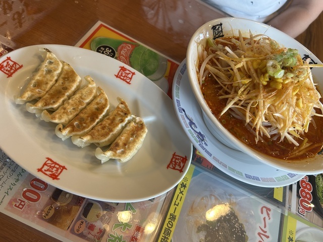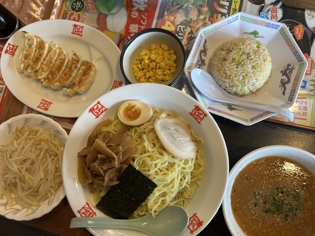 月にいち度は行きたい場所!おおぎやラーメンのつけ麺がすきでよく家族でランチをします。餃子や半チャーハンのセットも頼みました。