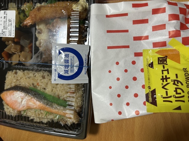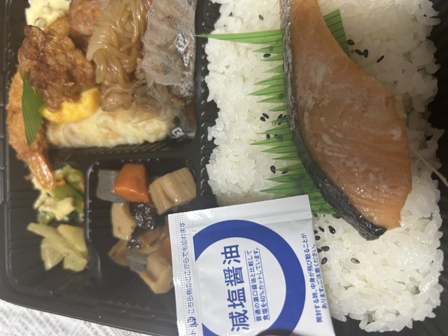 会社帰りに寄る場所。鮭弁当を頼みました。ご飯はひきのこご飯に変更もできたりします。唐揚げやポテトフライをたくさんかい帰ります。