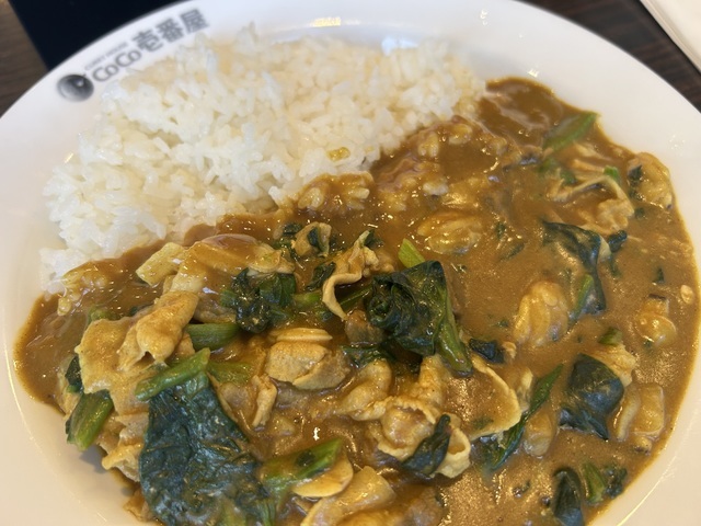 月にいちどは食べたいカレーです。パリパリチキンやイカリング、ほうれん草などをトッピング。カレーがおいしくて話しもはずみます。