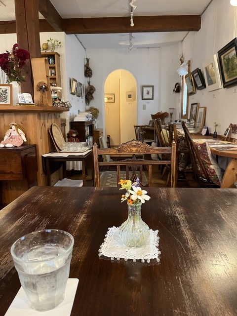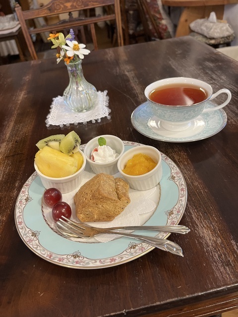 初めて訪れましたが、こんな素敵なカフェが近くにあるとは知りませんでした。今回はスコーンセット700円をいただきました。全粒粉の硬めのスコーンにホイップクリームとジャム、そしてフルーツがのっていて、見た目も綺麗です。コーヒーか紅茶が選べたので、紅茶にしてみました。アールグレイの紅茶が香りよかったです。ハンバーグのランチも気になったのでお聞きしたところ、、11時〜14時半までのランチタイムには1100円でセット価格だそうです。こちらも是非、次回いただきたいです。その他の時間帯は単品で提供とのことです。和の甘味もあり、ミネストローネのセットなどもあり、しばらく通いそうです。壁には素敵な絵画が飾られていて落ち着きます。また寒くなると暖かい暖炉に灯がともるのも楽しみです。