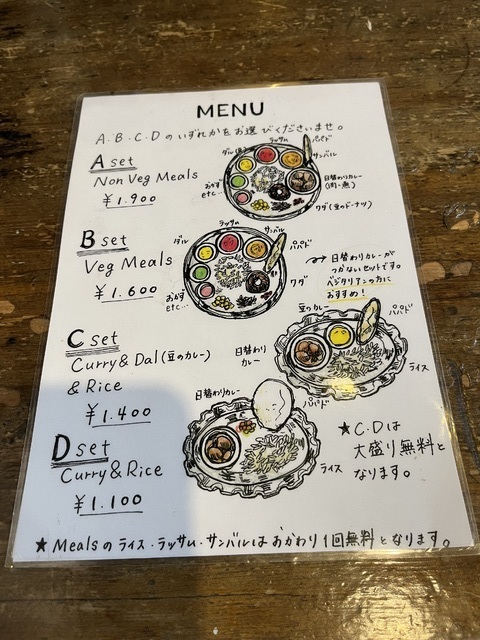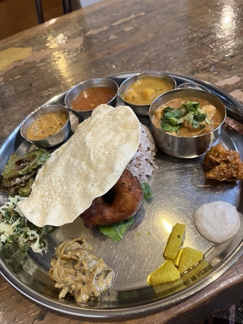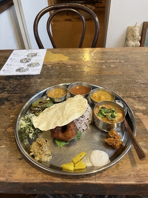数日前に行ったところ、14時過ぎでしたがカレーが終わり次第閉店とのことで食べられず、リベンジです。今回は12時半頃到着し、無事食べることが出来ました。ノンベジミールスでプラス100円で魚のカレーにしました。初めてだと言いましたら、色々丁寧に説明して下さいました。色々な味を楽しめて、全て美味しくて、また行きたいと思いました。豆で作ったドーナツ型のワダが外側サクッと中はフワッとしてて、もっと食べたかったです。寒かったので、あったかいマサラチャイもいただきました。スパイスとハーブは食べると元気になりますね。まさに薬膳!また食べに伺います。