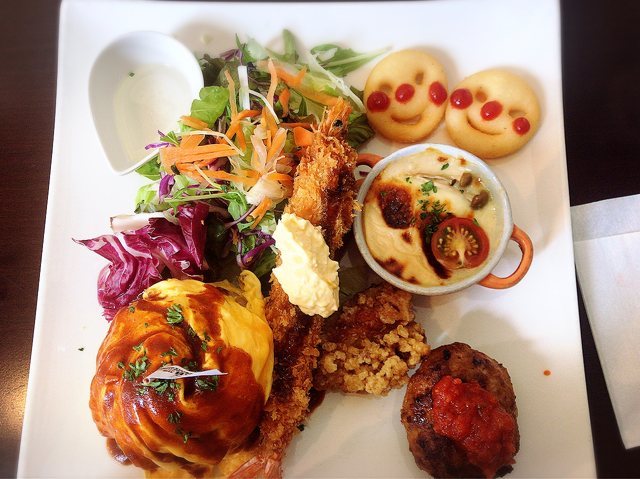 大人のお子様ランチを食べに行ってきました。さすが人気店ですね、開店前から4〜5組待っていました。大人のお子様ランチは、まずはスープ、次にオムライス、海老フライ、とりの唐揚げ、ミニハンバーグ、グラタン、ニコちゃんポテト、サラダがワンプレートになって出てきます。あとはドリンクとプチスィーツです。