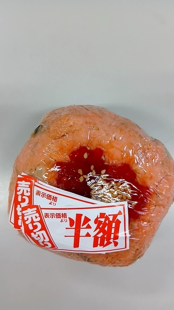 夜、仕事帰りに寄ったら、おにぎり半額で買えました。 鮭にいくらが載り、美味しそうです。お得に買えて良かったです。