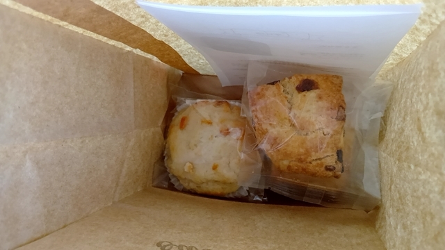 豆腐マフィン、プレーンスコーン買いました。 植物性バターだそうで、ざくほろのおいしいスコーンとマフィンでした。