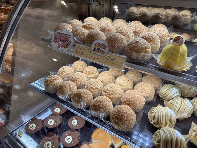 イチオシ商品である「プレミアムカスタードシュー」¥200を購入!上はカリッと、下はしっとりした二層構造の皮に、たっぷりのカスタードが詰まっている。大きくて綺麗なまん丸の形状も可愛い。