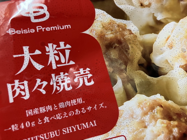 今晩のおかずはわが家御用達の倉賀野店でリピートしている焼売。大ぶりで食べ応えがあってしっかり美味しい。「肉々焼売」の名に恥じない逸品です♬