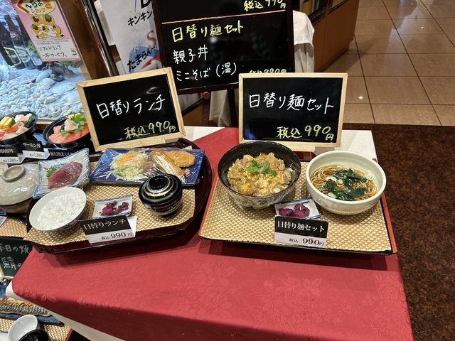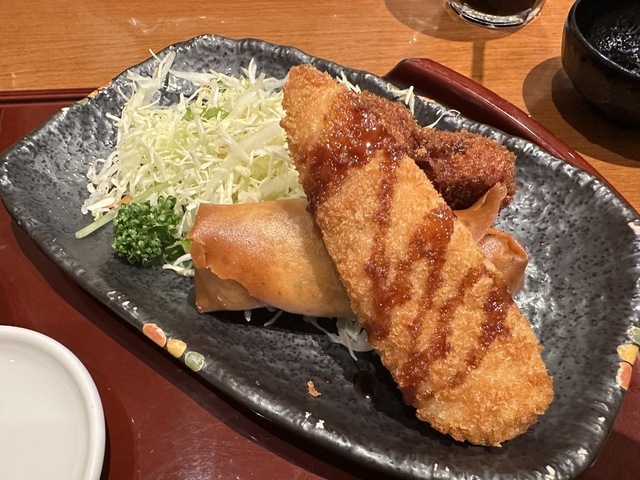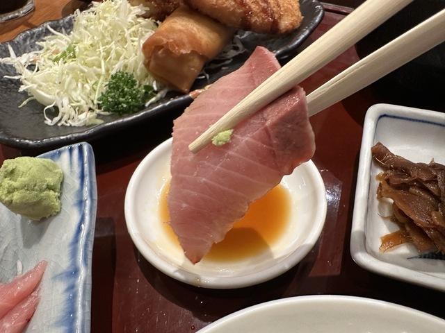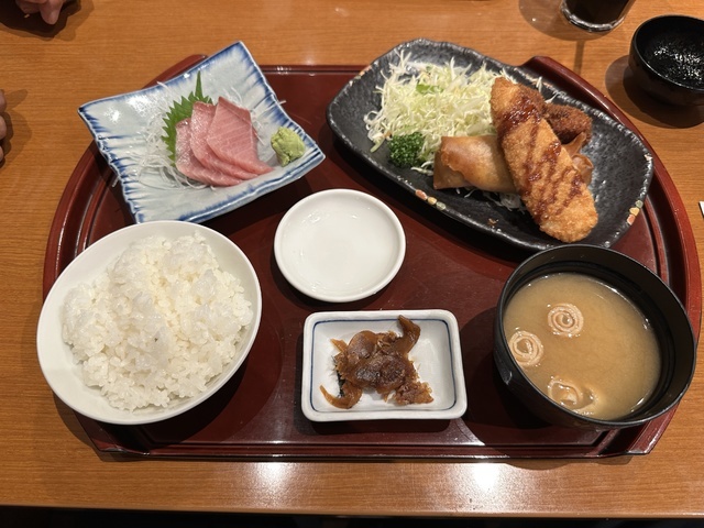 ●2025年11月7日(金) 晴 12:10訪問 12:22着膳。 ●今回は、「日替りランチ(本日の刺身+ライス+味噌汁+ミックスフライ+漬物)990円」を「100円OFFクーポン」使用して890円と「アイスコーヒー」を注文して女性店員に写真撮影の許可を頂きました。 ●アイスコーヒーは、Instagramでアカウントをフォローして無料で頂きました。 ●テーブル席でお冷やを飲みながら待っていると12分後に発注した「日替りランチ」が着膳しました。 ●日替りランチは、本日の刺身+ライス+味噌汁+ミックスフライ+漬物がセットの日替り定食でした。 ●本日の刺身は、新鮮なマグロの刺身が三切れ盛り付けてあり、山葵醬油を付けて食べたら美味しかったです。 ●味噌汁は、出汁がきいて麩とワカメの入った味噌汁で美味しかったです。 ●揚げ物は、里芋とササミフライと春巻でご飯との相性が良くて美味しかったです。 ●代金の支払いでd払いが使用できてヤマダポイントが付与されるので大変便利だと思いました。 ●リーズナブルで美味しい日替りランチを味わう事ができるので、又、訪問したいと思います。ご馳走様でした。