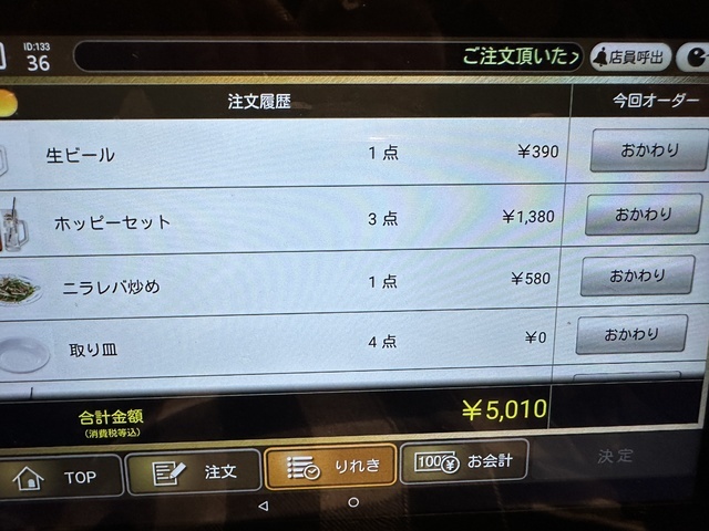 ●2025年11月7日(金) 晴 20:02訪問 20:17着座。 ●訪問時に店内満席で先客が数人並んでいました。 ●店内にある予約発券機で予約をして店外で少し待ちました。 ●店外で待っていると15分後に女性店員に番号を呼ばれてお店に入り、右側奥にあるテーブル席へ案内されました。 ●店員は、女性と男性が親切丁寧に切り盛りをしていました。 ●今回は、「ホッピーセット460円」を注文して女性店員に写真撮影の許可を頂きました。 ●ホッピーセットは、癖のない焼酎で飲み易くて美味しかったです。 ●料理は、「ニラレバ炒め580円」と「バクダン炒め600円」を頂きました。 ●ニラレバ炒めは、レバー、ニラ、もやしが炒めてありお酒との相性が良くて美味しかったです。 ●バクダン炒めは、豚肉、キャベツ、もやしがたっぷり入っていて美味しかったです。 ●飲み物の追加で「おかわり(中)250円」を数杯頂きました。 ●代金の支払いでd払いが使用できてJREポイントが付与されるので大変便利だと思いました。 ●リーズナブルで美味しいお酒を飲みながら美味しい料理を味わう事ができるので、又、訪問したいと思います。