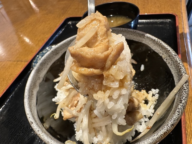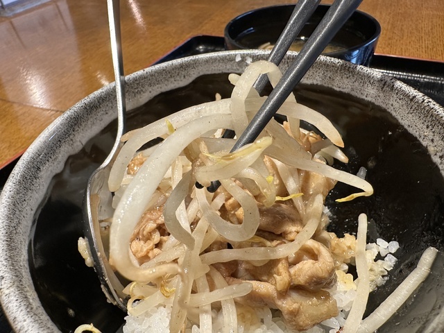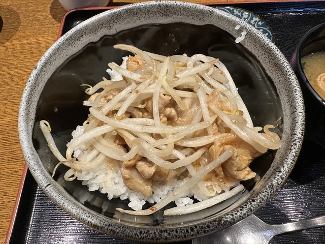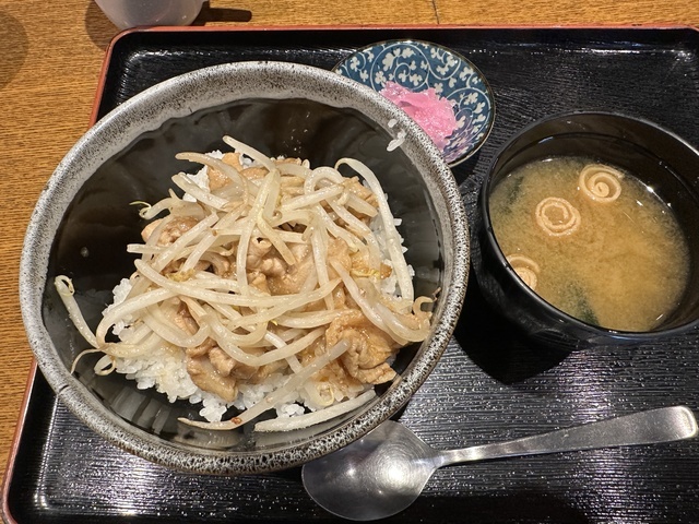 ●2025年11月11日(火) 晴 12:08訪問 12:20着膳。 ●今回は、「日替わり丼ランチ(豚肉もやし丼+味噌汁+漬物+ドリンク)750円」を注文して女性店員に写真撮影の許可を頂きました。 ●カウンター席でホットコーヒーを飲みながら待っていると12分後に発注した「日替わり丼ランチ」が着膳しました。 ●本日の日替わり丼は、豚肉もやし丼でご飯の上に豚バラ肉ともやしが盛り付けてあり、甘くない味付けの豚バラ肉が柔らかくてもやしが新鮮で美味しかったです。 ●味噌汁は、ワカメと麩がたっぷり入っている薄味の味噌汁で美味しかったです。 ●代金の支払いでPayPayが使用できるので大変便利だと思いました。 ●リーズナブルで美味しいランチを味わう事ができるので、又、訪問したいと思います。ご馳走様でした。