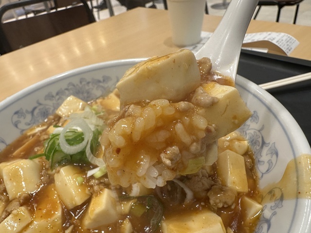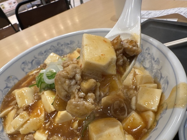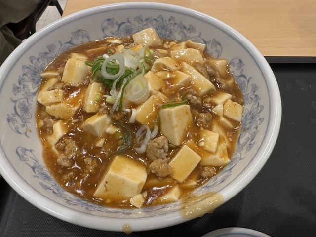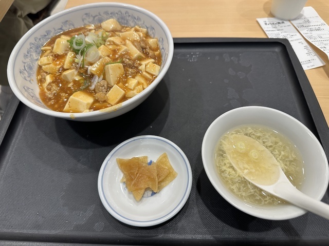 ●2025年12月12日(金) 晴 12:07訪問 12:13着膳。 ●今回は、「麻婆豆腐丼(麻婆豆腐丼+スープ+漬物)820円」を注文して代金をSuicaで前払いしました。 ●テーブル席でお冷やを飲みながら待っていると6分後に呼鈴が鳴り発注した「麻婆豆腐丼」を取りに行きました。 ●麻婆豆腐丼は、大きなどんぶりにご飯と麻婆豆腐と刻みネギが盛り付けてあり、辛さが控えめの麻婆豆腐で美味しかったです。 ●スープは、あっさりして薄味のスープで美味しかったです。 ●漬物は、適度な味付けで美味しかったです。 ●代金の支払いでSuicaが使用できてJREポイントが付与されるので大変便利だと思いました。 ●リーズナブルで美味しいおランチを味わう事ができるので、又、訪問したいと思います。ご馳走様でした。