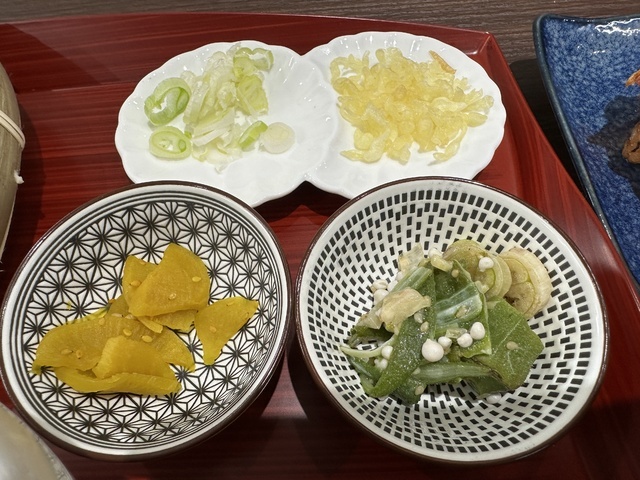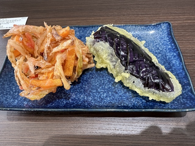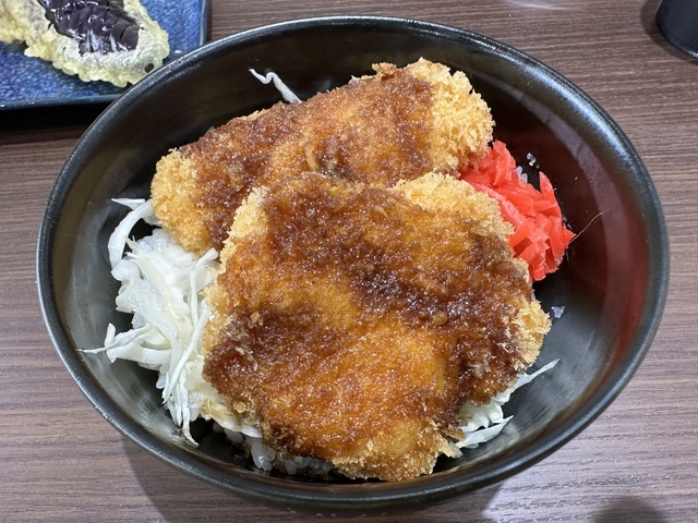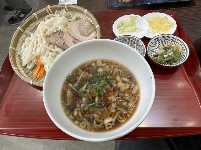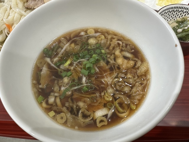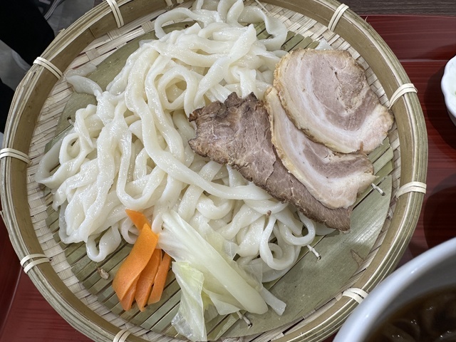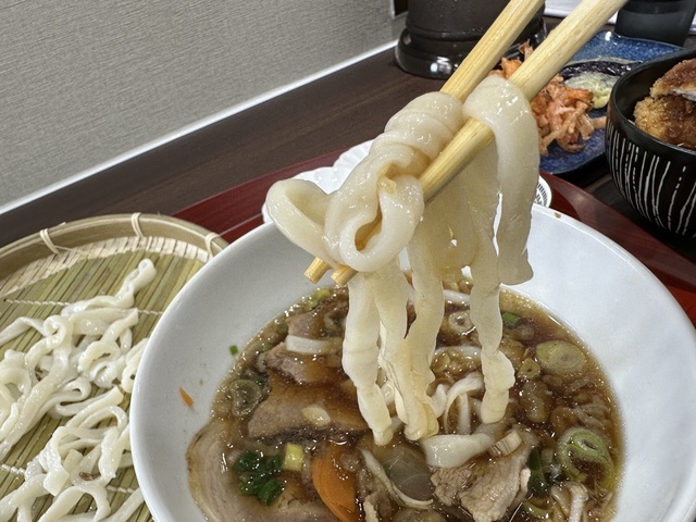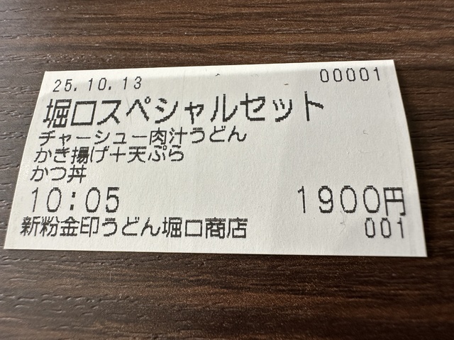 ●2025年10月13日(月) 晴 09:35訪問 10:01着座 10:03食券購入 10:24着膳。 ●今回は、券売機の一番左上にあるお店のお勧めと思われる「堀口スペシャルセット(チャーシュー肉汁うどん(麺250g)+かき揚げ+天ぷら+かつ丼)1,900円」を注文して店員に写真撮影の許可を頂きました。 ●カウンター席でお冷やを飲みながら待っていると食券を購入してから21分後に発注した「堀口スペシャルセット」が着膳しました。 ●チャーシュー肉汁うどんは、麺の上にチャーシュー、茹でニンジン、茹でキャベツが盛り付けてありました。 ●先ずは、麺とスープの味見をしてから残りの麺とかつ丼と天ぷらを食べました。 ●麺は、もちもちして食感の良い極太平打ち縮れ麺でスープとの絡みが弱めに感じましたが美味しかったです。 ●スープは、豚バラ肉、刻みネギ、青ネギ、揚げ玉等の具がたっぷり入っていて少し甘くてこってり気味の醬油スープで美味しかったです。 ●チャーシューは、柔らかくて薄味のチャーシューで美味しかったです。